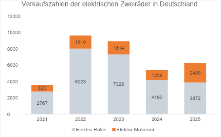 Nach dem starken Wachstum bis 2022 hat sich der Markt in den Folgejahren spürbar konsolidiert. Besonders E-Roller verzeichnen rückläufige Zahlen, während sich E-Motorräder stabilisieren und zuletzt wieder deutlich zulegen konnten. Das deutet darauf hin, dass der Markt reifer wird und sich zunehmend in Richtung leistungsstärkerer Fahrzeuge entwickelt.